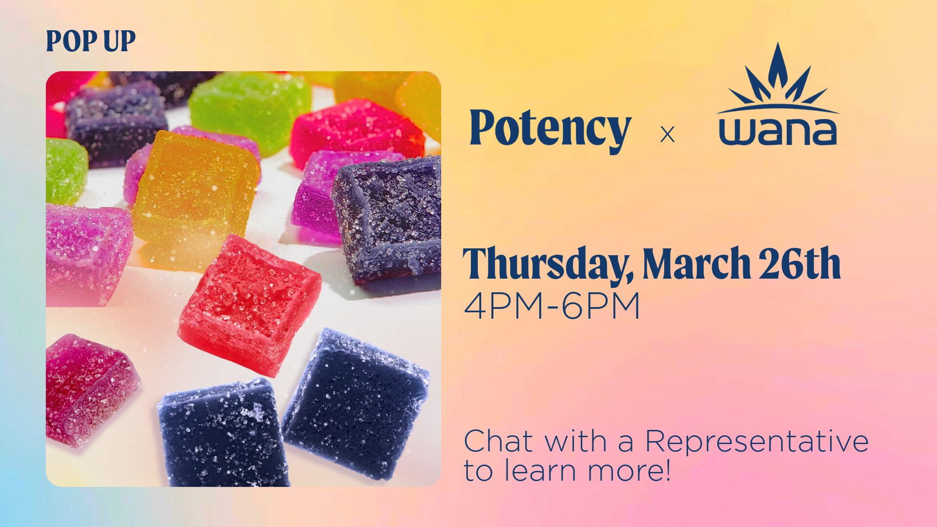 Potency Dispensary 1450 East St, Suite #1, Pittsfield, MA, United StatesA representative from WANA will be in-store to talk about their premium edibles, available in several flavors and formulas. Stop by and chat to learn more!