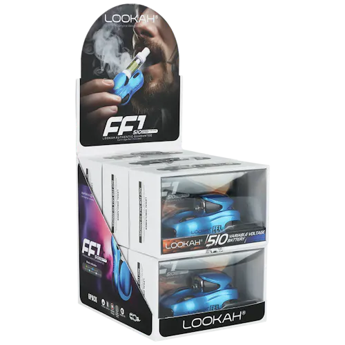 The Lookah FF1 Racecar Variable Voltage 510 Vape Battery has 5 preset voltage settings to choose from and is crafted with a sleek racecar shape with LED light indicator headlights. The Lookah FF1 has universal 510 threading and works with most 1mL and 2mL vape cartridge. This vape has single button activation, a preheat function, and fits comfortably into the palm of your hand. Users can charge up quickly with USB-C charging (charger not included).