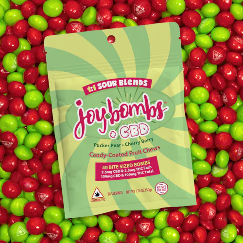 Treat yourself to deliciously sweet and sour flavors in a perfect blend of 1:1 CBD and THC with Sour Blends Joy Bombs + CBD! Every pouch includes a mix of two sour-soaked flavors: Pucker Pear and Cherry Berry!